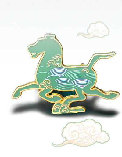 铜奔马于上世纪60年代出土于甘肃武威雷台汉墓,奔跑如飞的侧身形象广为人知,被确定为中国旅游标志。而从正面看,马头往左倾、嘴呈嘶鸣状,以这一形象开发的文创产品并不多见。