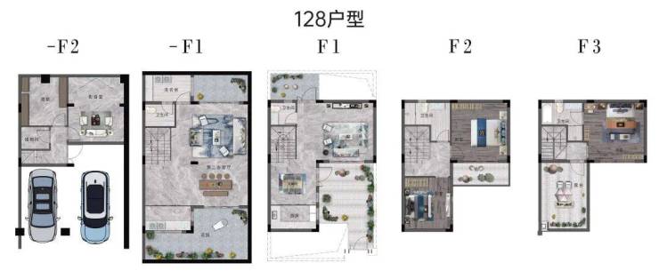 『户型鉴赏』【128㎡户型】联排设计、前庭后院、观星露台、采光与私密性极佳;超高附赠率,有天有地有花园,私家车位入库!(以下图片和视频仅作参考,实际交付为毛坯)