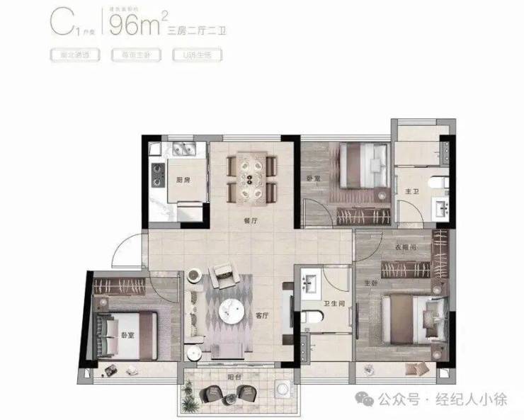 96㎡三房:南北对流,主卧带衣帽间,改善优选