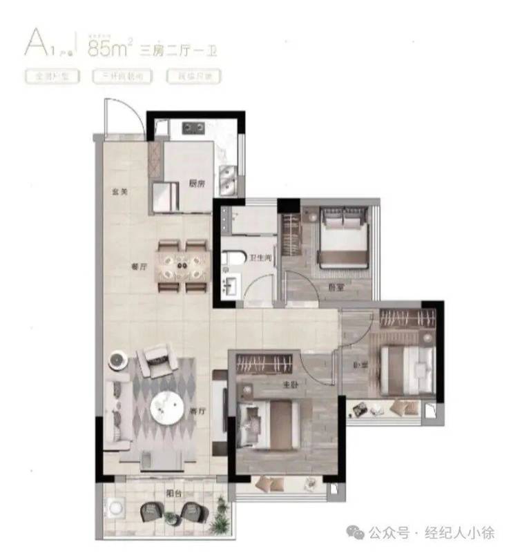85㎡三房:三开间朝南,刚需首选,总价可控