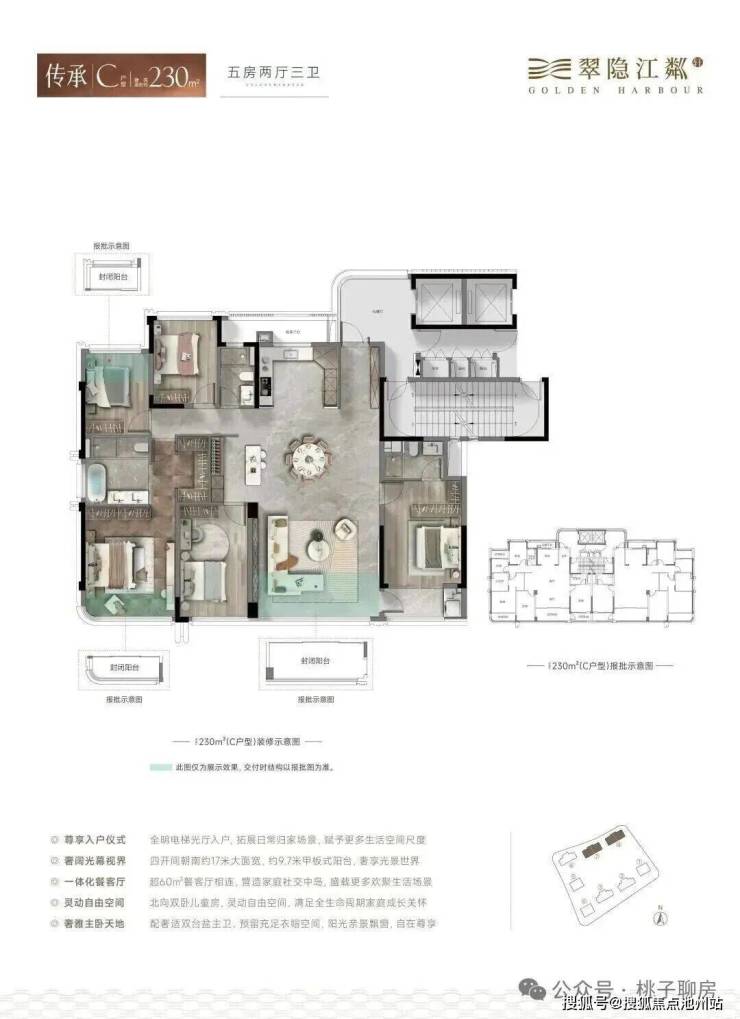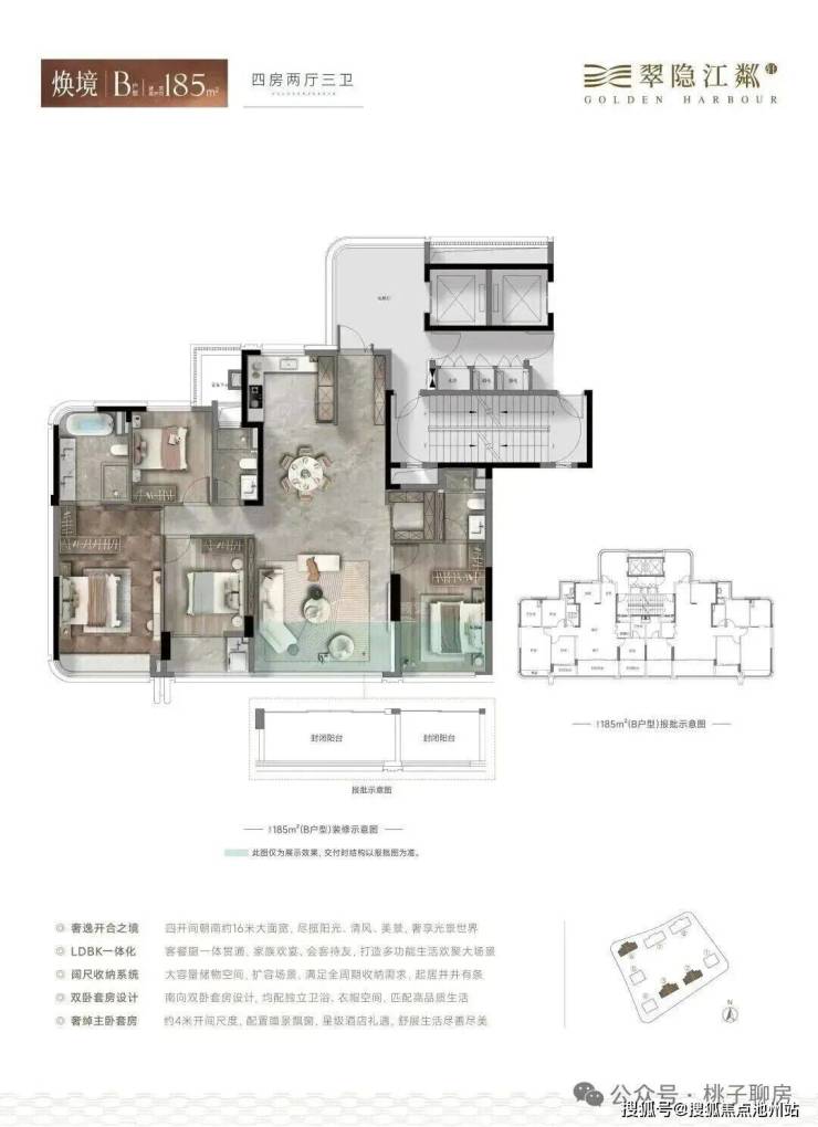 户型规划:主打161㎡、185㎡、230㎡的大户型,均为四房及以上设计,满足改善家庭一步到位的需求。户型设计注重空间利用率,采用LDKB一体化、干湿分离卫浴、U型厨房等布局,实际使用率较高(部分户型达90%),且户内无过多承重柱,便于后期改造。