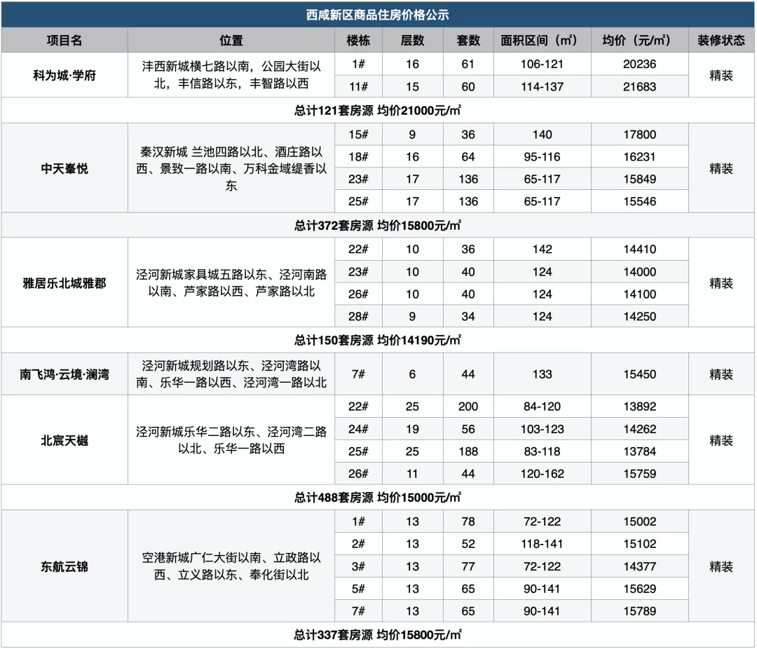 今天(11月5日),西咸新区6个盘新房价格公示,累计有1468套房,全为精装,均价区间1.38-2.16万/㎡。