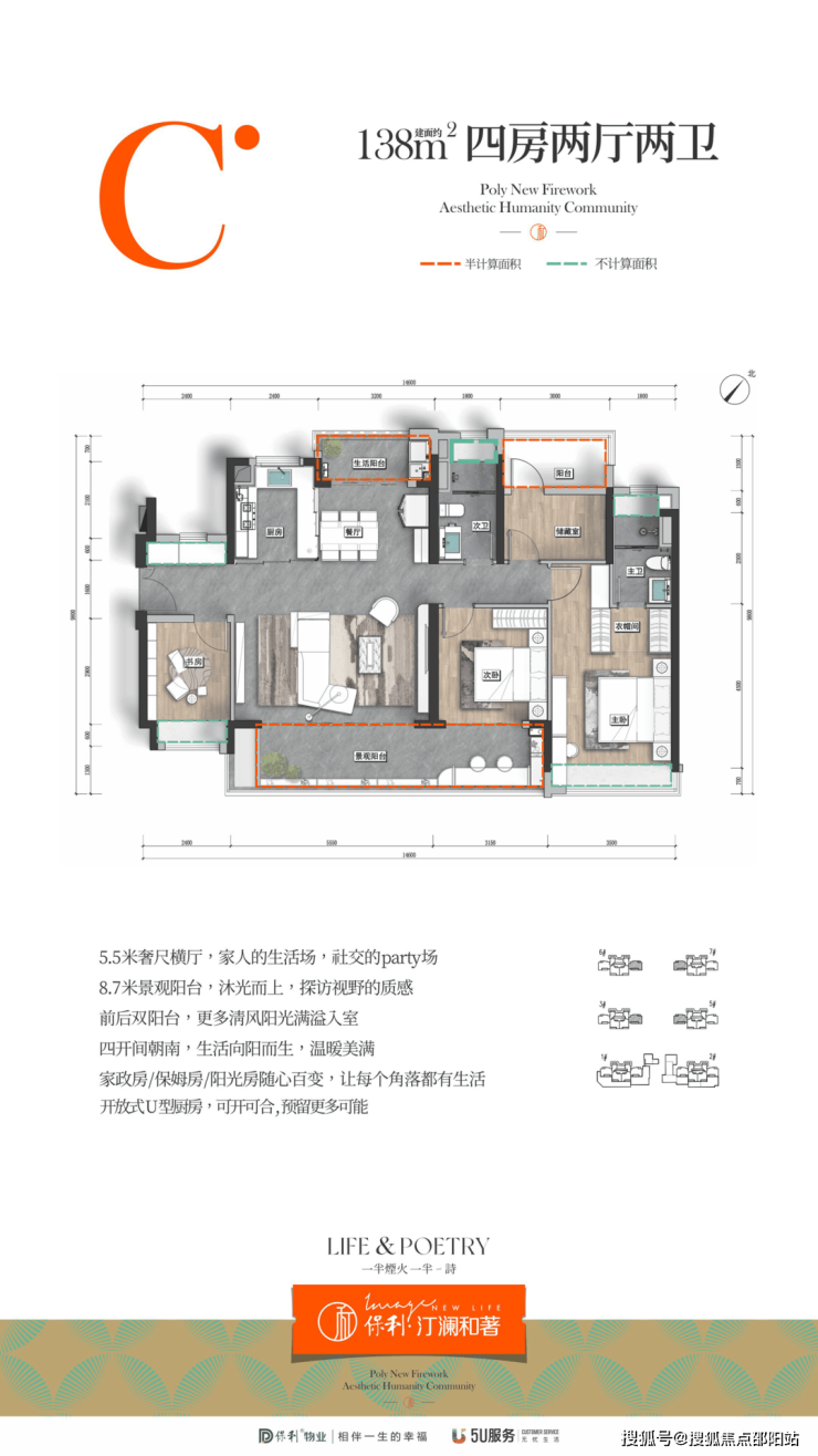 项目提供建面约109㎡三房两厅两卫、120㎡和138㎡四房两厅两卫,三个面积段可以对位不同购房群体。