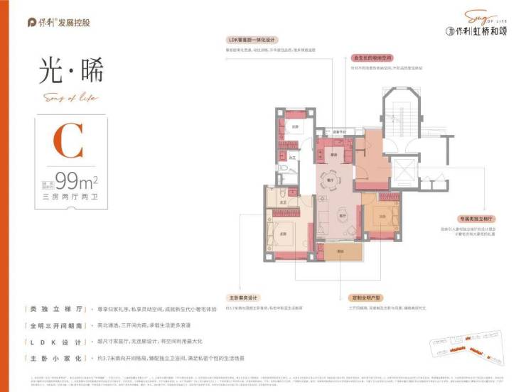臻奢建面约88㎡/99㎡户型,专属定制类独立梯厅,让生活拥抱私密和尊崇,LDK餐客厨一体化设计,动线流畅,链接多元生活场景,南北通透三开间朝南设计,承载生活更多浪漫。