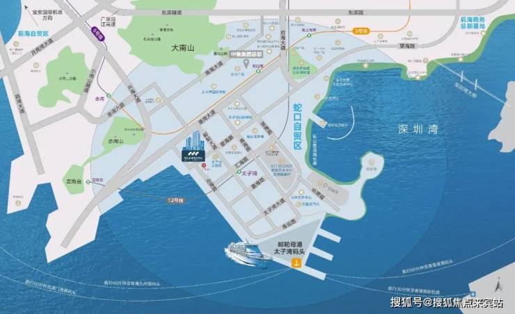 交通方面:项目邻近蛇口邮轮中心,周边还环伺多条主干道路、深港澳三大国际机场、地铁2号线蛇口港站(距离约400m)和12号线太子湾站(距离约150m)、深圳湾口岸,多维枢纽交通通达全球,构建粤港澳大湾区1小时生活圈。