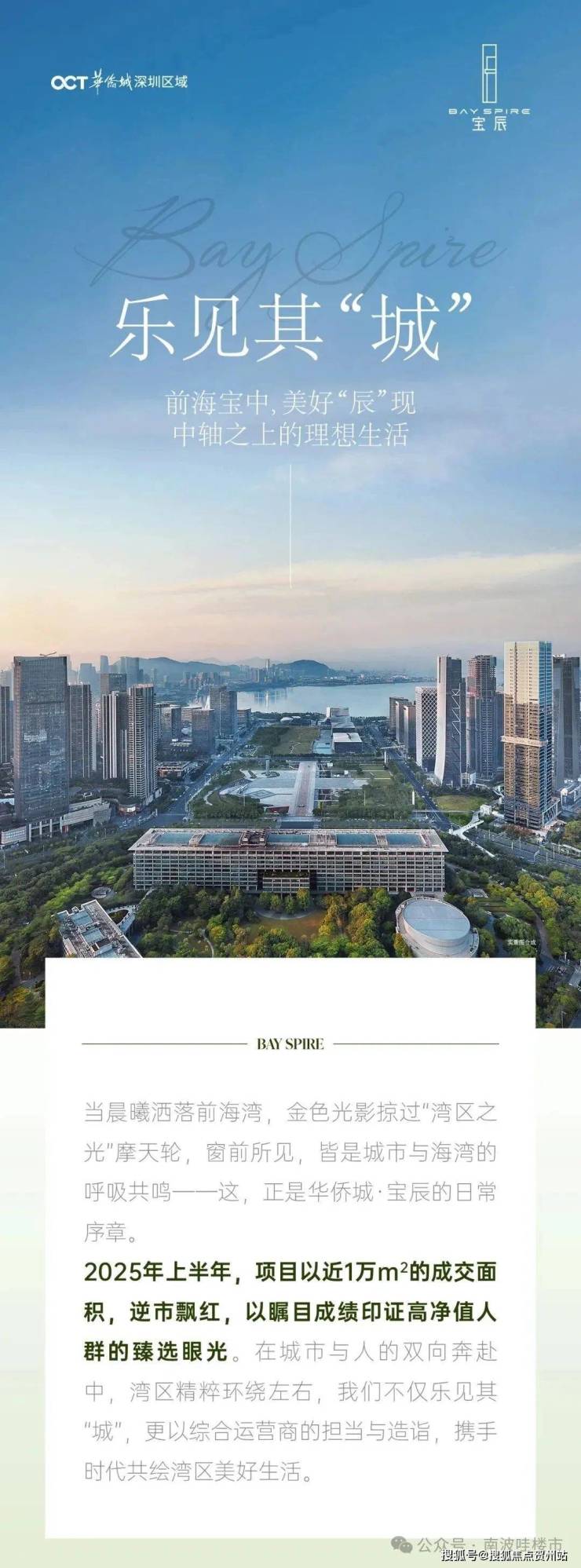 华侨城宝辰位居前海湾中轴之核,踞守湾区总部经济区前海湾处于珠江口东西两岸发展版图的核心,是继深圳湾后,深圳重点打造的“黄金内湾”,融合了山、海、林、城、岛、港、湾等特色资源。内湾由宝中、腾讯未来科技城(大铲湾)、妈湾、前湾、桂湾等片区环绕形成,为前海扩容后的核心组团,也是深圳西海岸上的湾区门户。