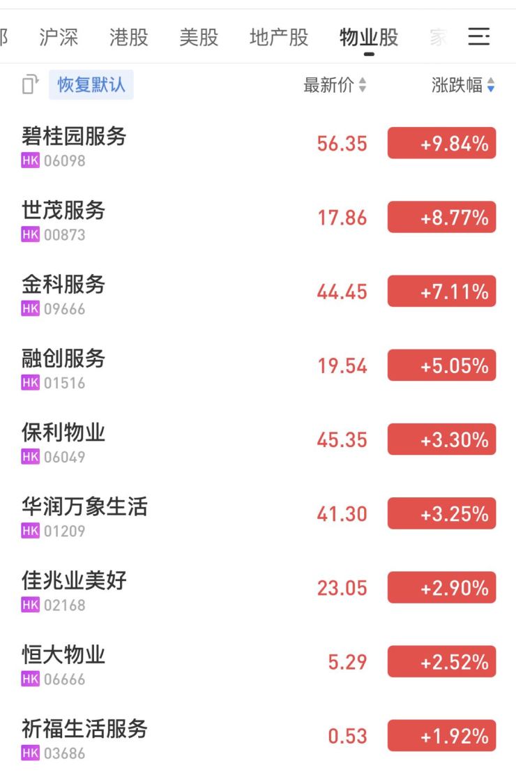 其中,碧桂园服务涨9.84%、旭辉永升服务涨9.61%、世茂服务涨8.77%、金科服务涨7.11%、融创服务涨5.05%、保利物业、华润万象生活涨超3%、恒大物业涨2.52%。