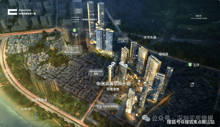 中洲滨海华府、也叫中洲湾迎海花园二期位于深圳市红岭实验学校上沙学校隔壁,四面环景,高层可观深圳湾滨海景观。南邻红树林自然保护区;北瞰高尔夫球场、福田CBD建筑群;西望深圳湾滨海休闲带。