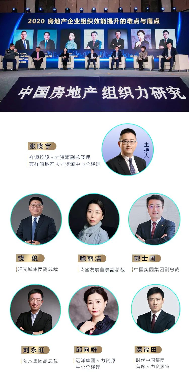 成果发布后,在祥源控股人力资源副总经理兼祥源地产人力资源中心总经理张晓宇主持下,阳光城集团副总裁饶俊、荣盛发展董事副总裁鲍丽洁、中国奥园集团副总裁郭士国、领地集团副总裁刘永旺、远洋集团人力资源中心总经理邱向群、时代中国集团首席人力资源官滦福田以“2020 房地产企业组织效能提升的难点与痛点”为议题进行圆桌论坛。