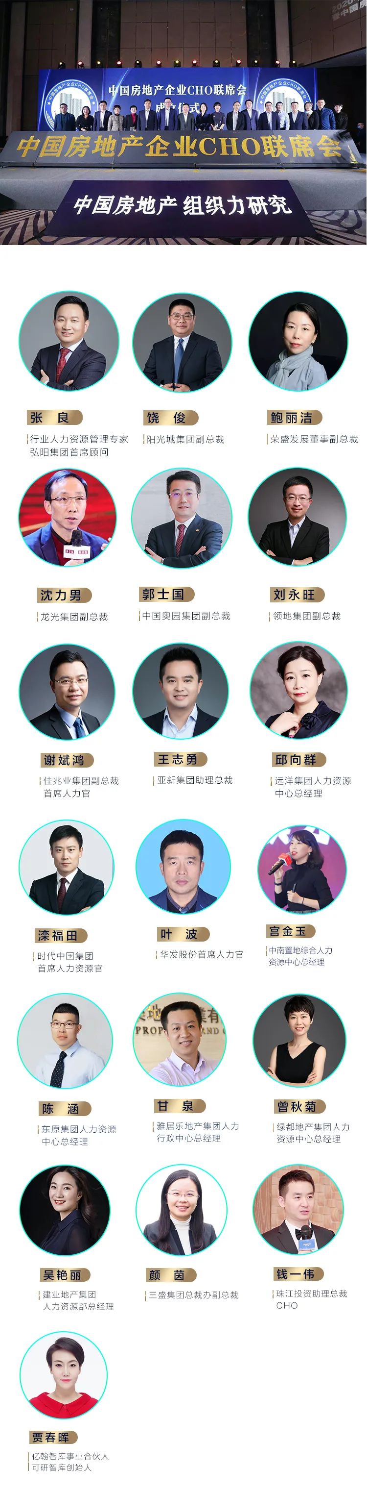 行业人力资源管理专家、弘阳集团首席顾问张良、阳光城集团副总裁饶俊、荣盛发展董事副总裁鲍丽洁、龙光集团副总裁沈力男、中国奥园集团副总裁郭士国、领地集团副总裁刘永旺、佳兆业集团副总裁、首席人力官谢斌鸿、亚新集团助理总裁王志勇、远洋集团人力资源中心总经理邱向群、时代中国集团首席人力资源官滦福田、华发股份首席人力官叶波、中南置地综合人力资源中心总经理宫金玉、东原集团人力资源中心总经理陈涵、雅居乐地产集团人力行政中心总经理甘泉、绿都地产集团人力资源中心总经理曾秋菊、建业地产集团人力资源部总经理吴艳丽、三盛集团总裁办副总裁颜茵、珠江投资助理总裁、CHO钱一伟、亿翰智库事业合伙人、可研智库创始人贾春晖等企业高管共同站上舞台,举起酒杯,洒下金粉,在金彩烁光共同见证“房地产企业CHO联席会”的成立。