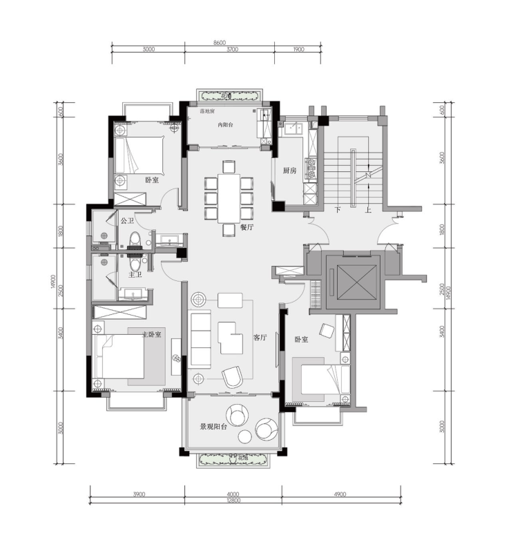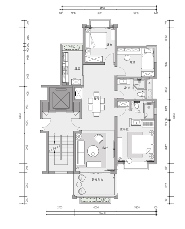 3、C户型:建筑面积约130平方米三房两厅两卫
