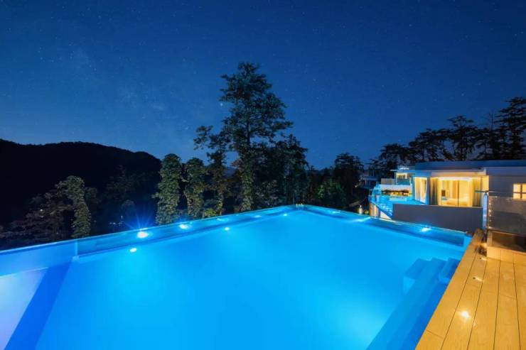 内部构造与景观亮点纷呈:山顶之上,树屋如诗,成为度假探索的必访之地;悬空泳池,凌空三十三米,不仅是亚洲创举,更是将游泳体验提升至云端漫步之境,其下搭配的酒吧与棋牌室,为泳池派对与私人盛宴量身定制。爱心泳池温柔以待,白色沙滩与玻璃栈道引领梦幻之旅,高尔夫推杆、水上教堂及直升机停机坪,每一处都是对极致生活追求的诠释。更有高达二百零八席的户外泳池体系,恒温服务确保四季畅游,其中标志性悬空玻璃泳池,让每一次划水都伴随着山谷间的风语,仿佛自由飞翔。