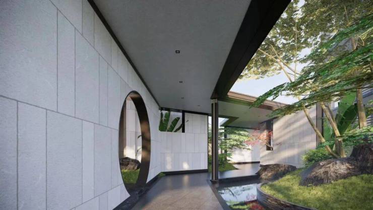 山中有山,水中有水。一进山水院,以叠石奇景,精巧花木为主,赋山形,观山语,呈现了一种如居山中的归家体验。二进镜水院,以水景、曲桥、角亭为主,呈现了符合中式生活特色的园林空间。