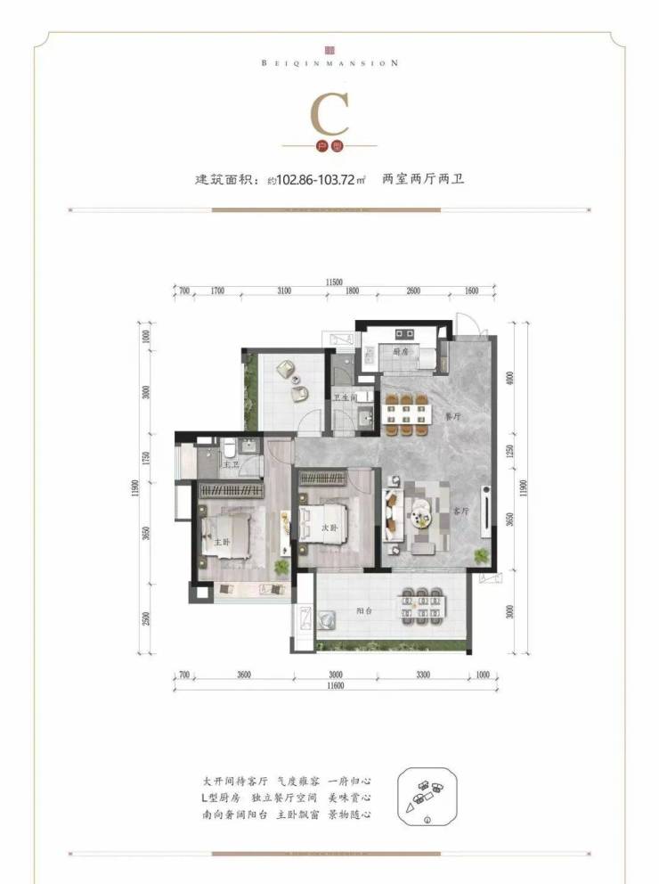 103平米 2+1房+两卫