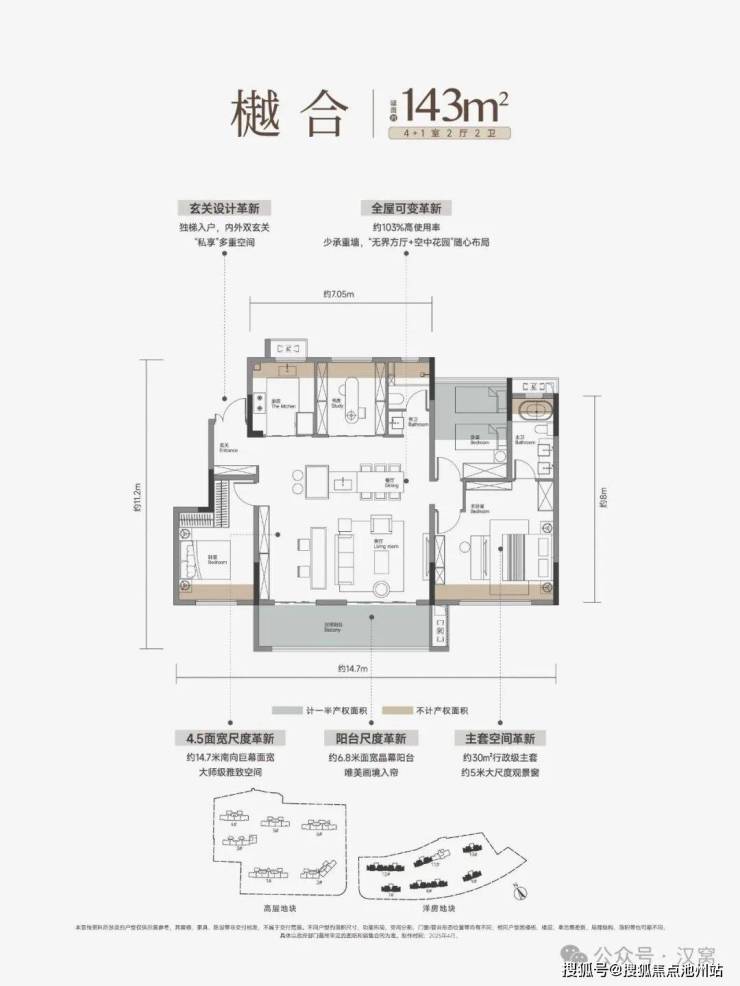 洋房面积142㎡,得房率达到103%,客厅连接阳台,阳台一半面积赠送,卧室利用好飘窗,空间感直接拉满。采用S墙设计,空间布局更合理