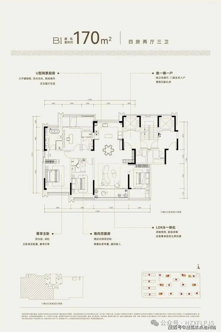 建面约170方B1户型,四房两厅三卫