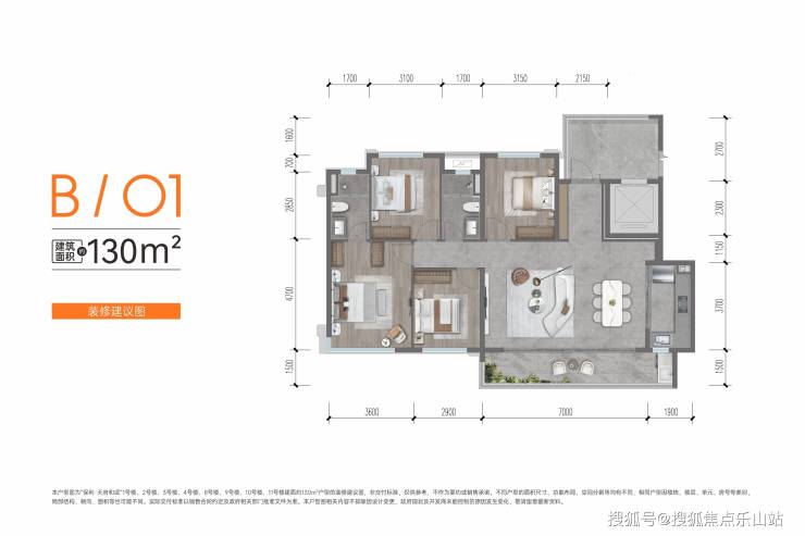 130㎡(2T2户):舒适四房,改善型空间,公私分区明确,主卧套间设计。