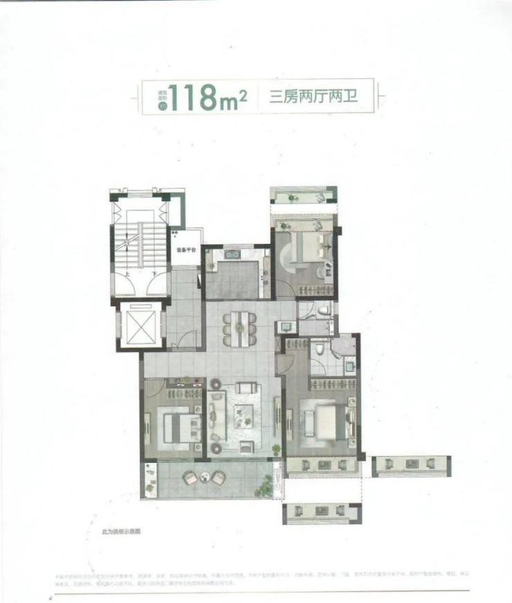 以本次即将加推的118㎡三房两厅两卫产品为例,户型方正,设计合理,没有多余的浪费空间。整体来看,动线合理,动静分区,南北通透,没有一处暗室。