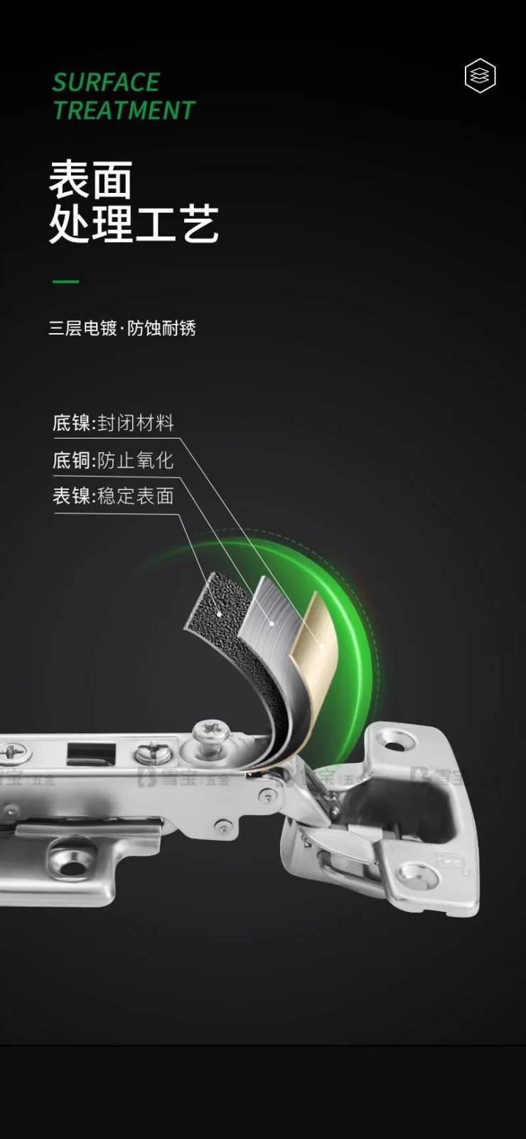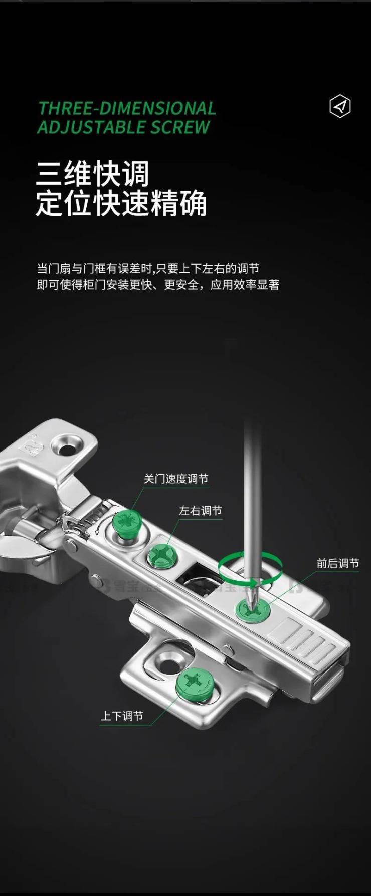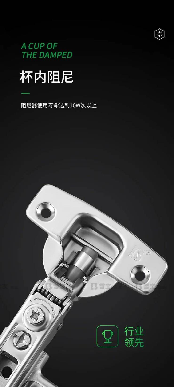 雪宝超级静音铰链系列产品匠心铸造,采用国际领先的工艺技术,超强防锈、静音缓冲、安装便捷等能力经得起种种考验,无论在油烟聚集的厨房,还是潮湿通风不佳的洗手间,依然保持光亮如新,轻柔无声,开合自如!