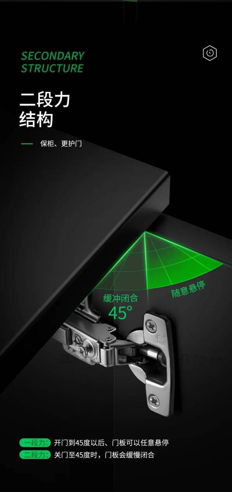 2、二段力结构,保柜更护门,缓冲闭合,随意悬停;
