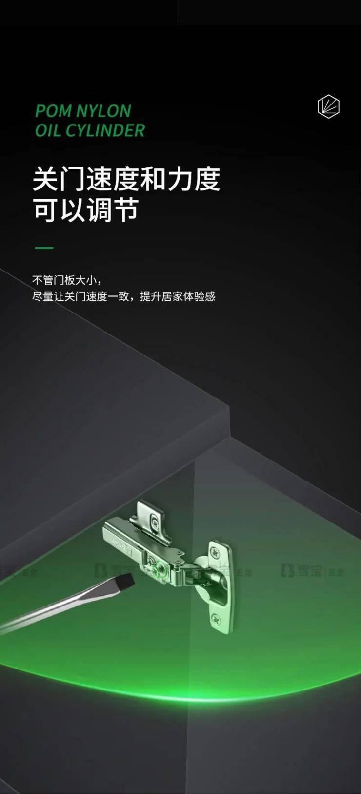 5、进口POM(铰杯内置)阻尼器,质量稳定,缓冲效果明显,关门速度不受气候与环境温度影响、速度不变;