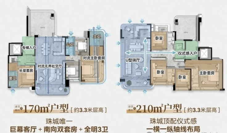 170-220㎡四房空间开阔,部分户型能俯瞰珠江,两梯两户带来私密体验,还配备中央空调整温、全热交换新风系统,双层中空LOW-E玻璃能有效隔绝噪音,居住体验更佳。