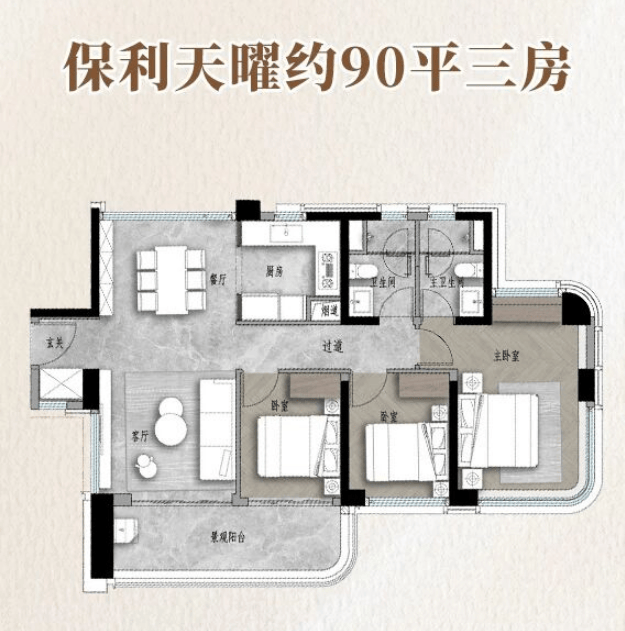 90㎡三房户型紧凑实用,动静分区合理,南向阳台和主卧飘窗保证了充足采光,两梯四户的配置让日常出行不拥挤;