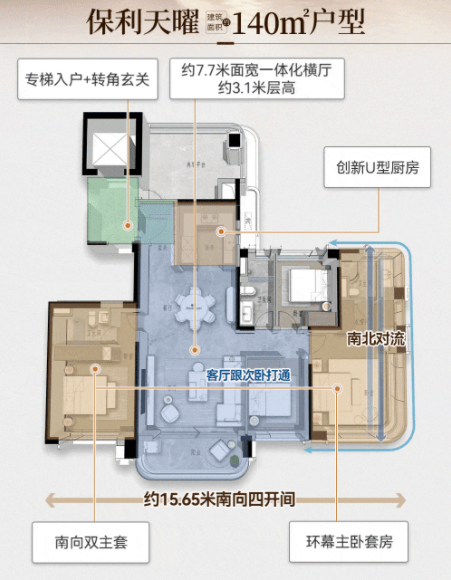 120-140㎡四房南北通透,厨房连接生活阳台,储物空间充足,适合三口之家或三代同堂,部分两梯三户的设计提升了居住舒适度;