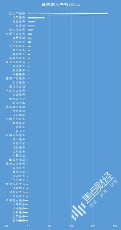 其中,头部物企的融资额度远高于中小物企。2021年,碧桂园服务凭借两次配售+一次发行可转债,拥有183亿的融资净流入额,高居榜首,为上市物企总融资额度贡献一半。