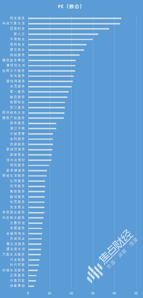 截至5月17日,52家上市物企中,特发服务的PE较高,达43.04倍;华润万象生活受以高毛利的商业运营为主,获得42.46估值;而招商积余、中海物业、保利物业、建发物业等受益于央国企背景,估值靠前。