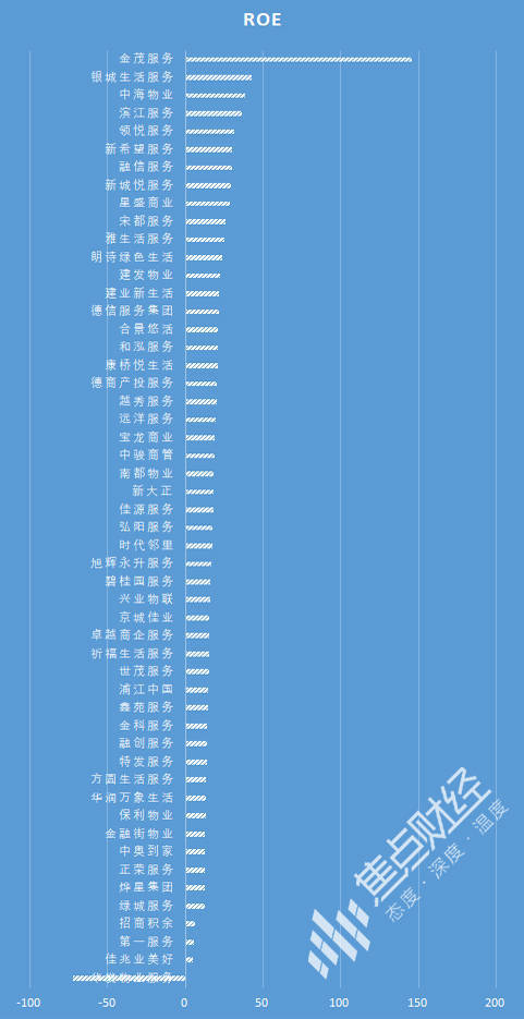 2021年,52家上市物企的平均资产收益率为19.79%,低于2020年的25.67%,但仍远高于房地产行业。2021年,有21家物企ROE高于平均值,其中,今年上市的金茂服务ROE高达145.57%,独占鳌头;另有32家物企ROE处于10%-20%之间,仍有上升空间。