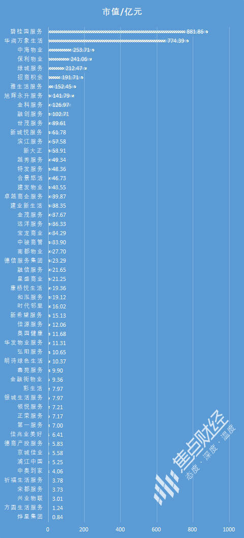 截至2022年5月17日,52家上市物企中,无物企市值超千亿,仅有市值超百亿。其中,行业龙头碧桂园服务市值为881亿元,虽稳居市值排名前列,却较去年2000亿的先进市值跌了千亿。华润万象生活以774亿的市值排在第二;随后,300亿-500亿市值出现“断层”,第三位的中海物业仅有253亿元市值,另外还有17家物企市值不足10亿,两极分化明显。