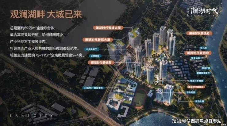 澜湖时代,由深物业集团开发,项目总占地面积约6.8万㎡,总建筑面积约62万㎡,计容建筑面积约43万㎡,共分3个地块开发,总规划约2700户,将建成集产业生产研发、住宅、商业街区于一体的产城综合体,是龙华北片区新的大型标杆项目。