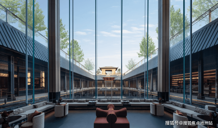 在玻璃幕墙前,还做了沙发会客区,正对泗水归堂下沉庭院。坐在这里,视野通透开阔,视觉层次十分丰富,看看庭院风景,心情也会豁然开朗。
