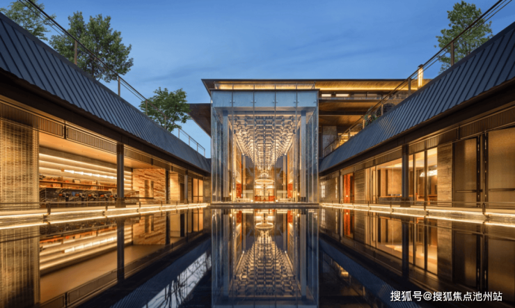 与普通会所不同的是,乾庚·和玺会所汲取了旧金山Apple Park的无界通透理念,以巨型无框玻璃幕墙消解内外空间界限,整体看起来宛如一座透明的玻璃盒子。