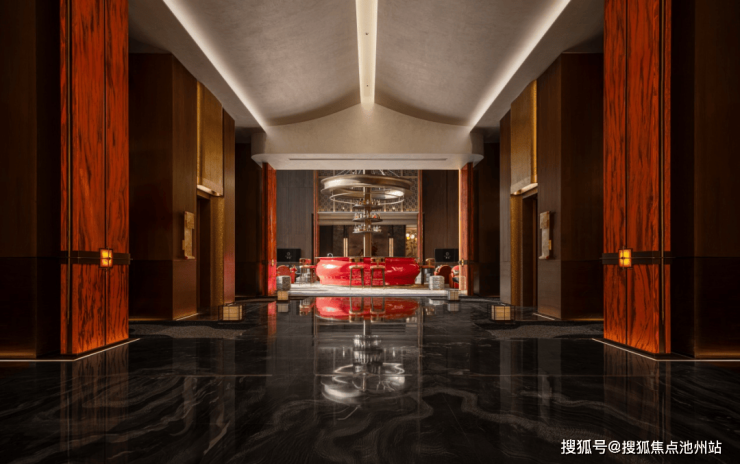 正对门厅的景墙,是一尊黑松山石影壁,与1:1复刻北京恭王府的“福字碑”搭配,暗合“洞天藏福”的哲学。抬头,看见的是国花牡丹珐琅华顶,寓意鸿运当头,给身心带来极致享受。门厅两侧,故宫同款椒图神兽,出入迎祥,镇宅兴业。层层高规格礼序的递进,不仅带来大气磅礴的恢弘感,更彰显了业主的显赫身份。