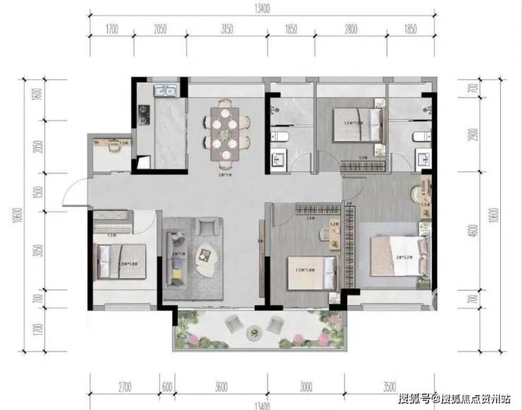⑤户型五:140㎡的4房2厅2卫,(分布在C座05户,朝东南向),竖厅南北通透户型格局,客厅开间3.8米,客厅连接次卧出6.6米大阳台,LDKB一体化设计,四开间朝南,4个卧室开间分别是:3.5米/3米/2.8米/2.7米,得房率约90%(包含赠送)。