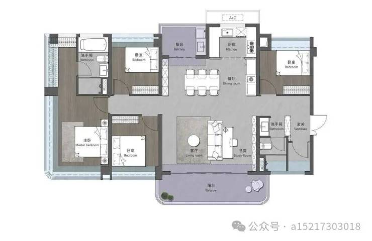 149㎡创意四房两卫,超大横厅连接环幕阳台,南北双阳台
