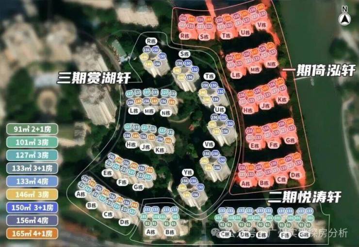 赏湖轩,三期建于2005年,由13栋1梯4户的13层小高层住宅和6栋2梯6户的20层高层住宅组成。三期的园林设计是最好的,而且有湖景。