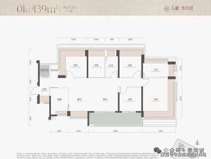 户型为113-114-115㎡四房和139㎡五房,标准层布局与保利瑧誉非常类似,但是没做独立电梯厅,2梯5户使用率高,凸窗做满再加上设备平台,所以赠送后得房率去到100%。