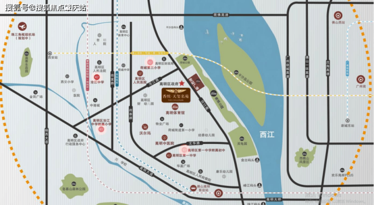 1枢纽:规划中的珠三角新干线机场综合交通枢纽(即高明机场),2高速:经莞佛高速、广州绕城高速,1小时畅达珠三角生活圈,3轨道:高明有轨电车、佛山地铁二号线、肇顺南轻轨3条轨道未来互接