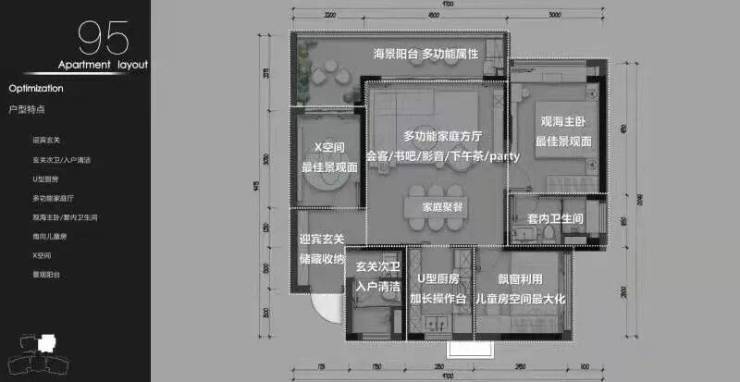95平米三房两卫:1.超大6.5米转角阳台一线看江.2.户型方正没有浪费.3.客厅开间去到4.5米.方正大气.4.动静分区,三卧室分开,舒适度私密性极佳.