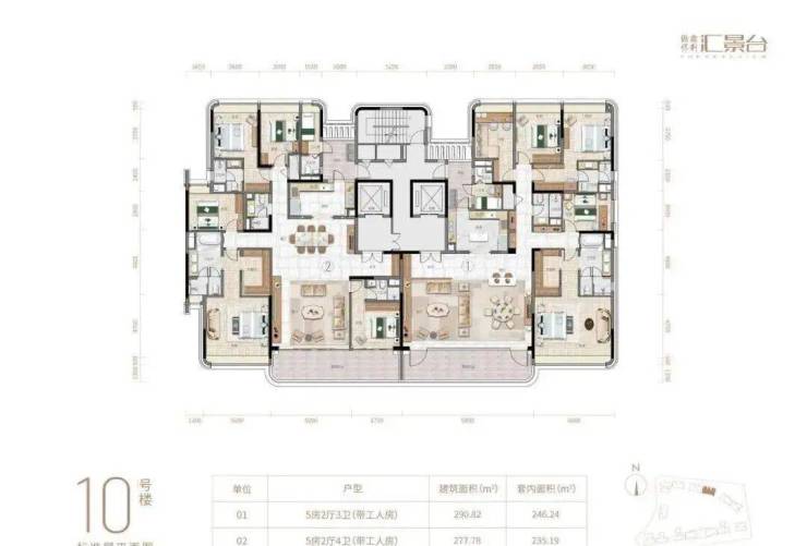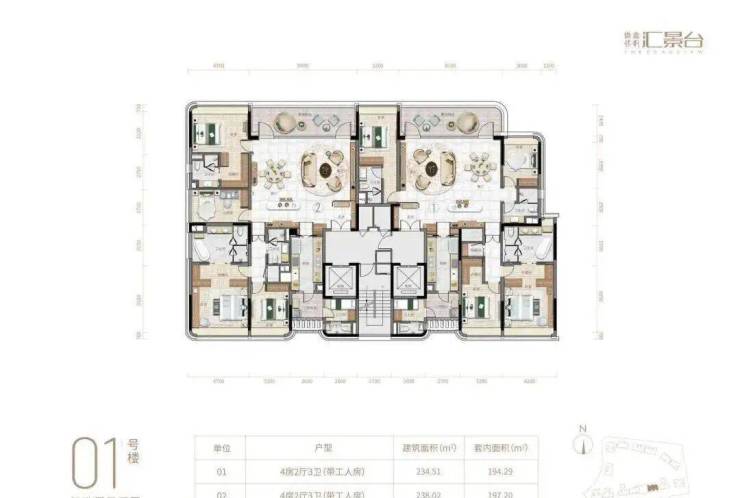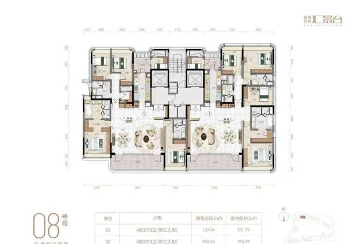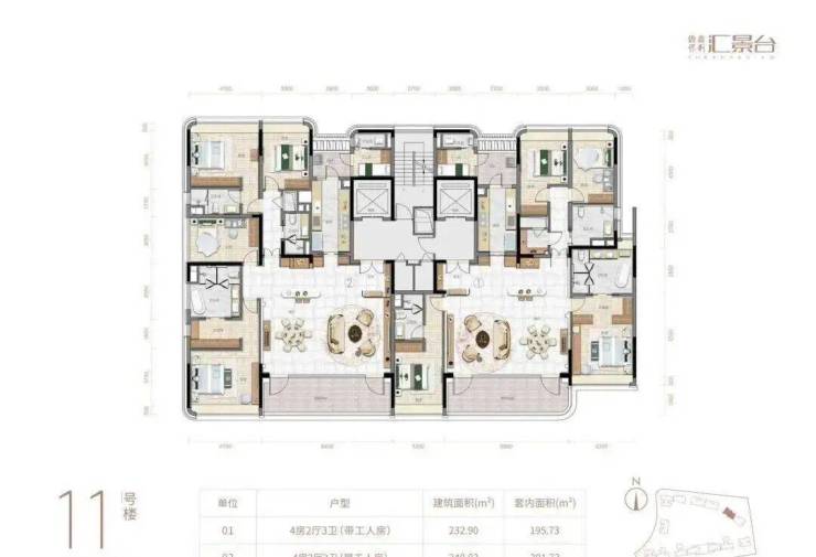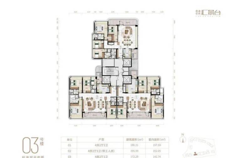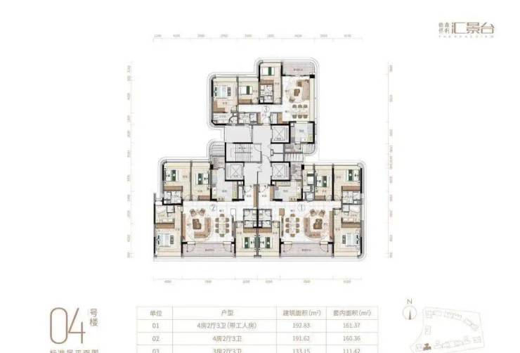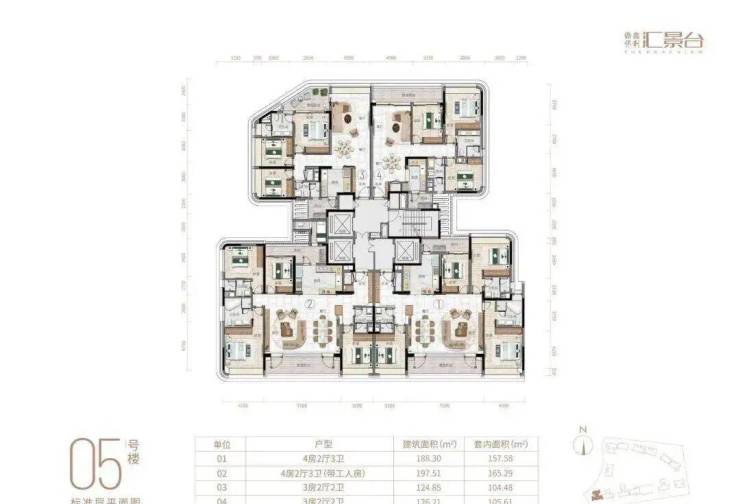 项目由14栋12层小高层组成,产品涵盖123-352㎡三至五房,共8类户型,户型实用率约82-84%