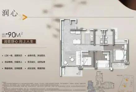 90㎡三房两厅两卫户型,总价约485-525万,部分特价房源420万起,双卫设计更适配三口之家,动静分区合理,客厅连接阳台,通风效果好;