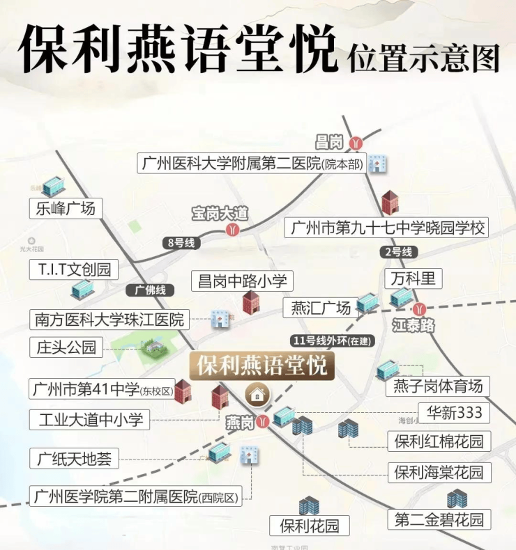 双地铁:燕岗站,1号线(广佛线)、11号大环线(建设中,预计今年通车)双地铁上盖,4站达上涌、8站达琶洲,轻松链接全城。