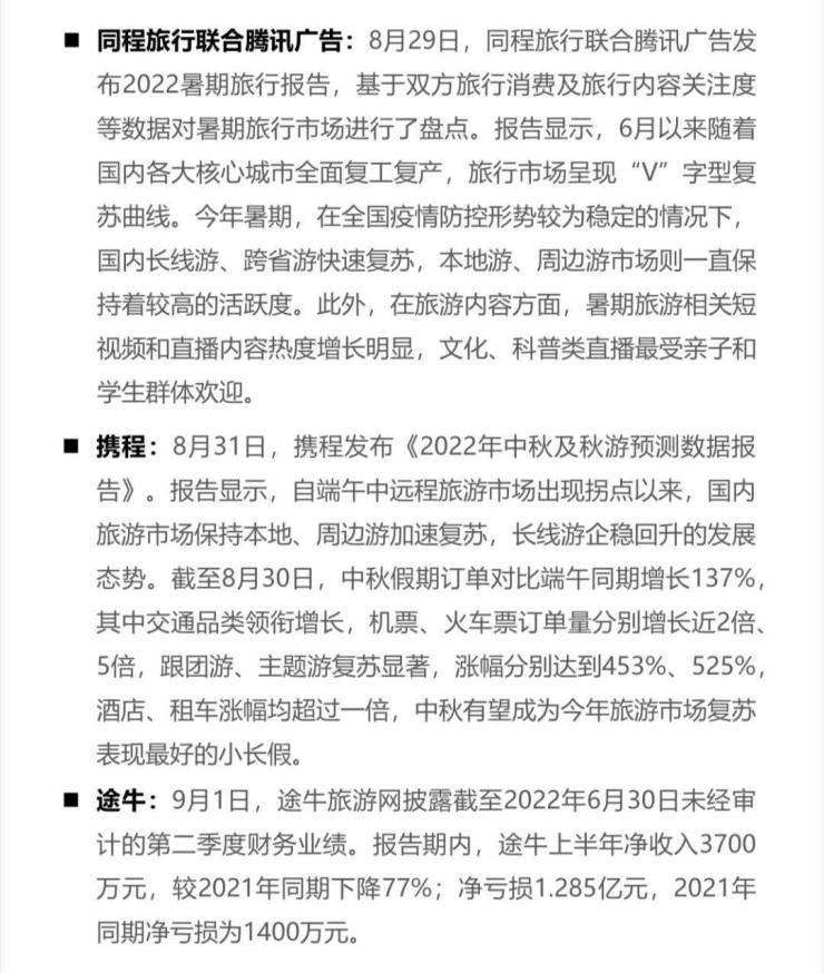 本周,携程发布《2022年中秋及秋游预测数据报告》。报告显示,自端午中远程旅游市场出现拐点以来,国内旅游市场保持本地、周边游加速复苏,长线游企稳回升的发展态势。截至8月30日,中秋假期订单对比端午同期增长137%,其中交通品类领衔增长,机票、火车票订单量分别增长近2倍、5倍,跟团游、主题游复苏显著,涨幅分别达到453%、525%,酒店、租车涨幅均超过一倍,中秋有望成为今年旅游市场复苏表现较好的小长假。