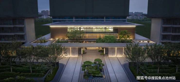 近百米超级市政界面,入口中心绿岛和两侧景墙提升昭示性和领域感,酒店式环岛落客,中心以盆景式绿岛将植物形态造型美和场地的气势意境紧密结合,两棵造型油松苍劲挺拔,展现出场地独特气质,极具东方美学的臻如府大宅由此开启。
