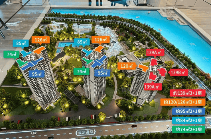 项目一期户型面积74-170㎡,三至四房设计,四开间以上朝南,通透性好。二期户型63-82㎡,小户型使用率最高达107%,在同等面积段中空间感更强。