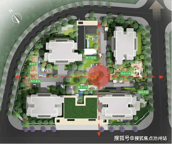 在设计之初,熙宸设计团队曾深入考察场地,让自己化身业主,模仿业主的归家动线时所见、所闻、所想去考虑应该要如何造园造景选树?最终将"摩登臻境 林隐森居"的理念融入设计——针对性的打造出“一心·两轴·六境”的园林景观布局,涵盖鎏光水院、轻氧聚场、森游乐园、揽月观庭等多维景观空间。业主可在不同景观空间休闲阅读、邻里社交、活力运动等。
