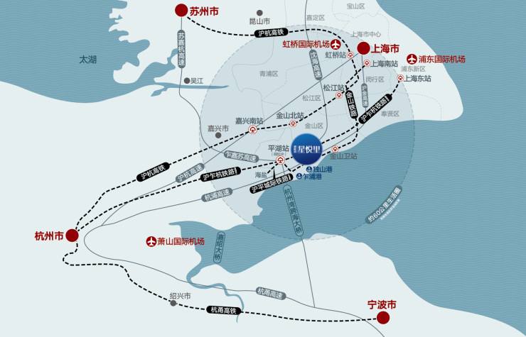 交通配套:沈海高速、沪昆高速,沪乍杭铁路、沪平城际铁路(规划),平湖居民可在上海刷市民卡和公交卡乘坐公交、地铁、轮渡,并且乘坐沪平城际快线。项目附近交通非常方便,距离新仓高速出入口仅3km,从我们项目驾车5分钟就能到达新仓高速口(G15沈海高速),到达上海金山约6公里、到达上海虹桥约60公里、到达浦东新区约80公里、往北50公里到达苏州,往西约90公里到达杭州、到达宁波约60公里。真正实现了约半小时到上海,约一小时到苏杭,能够便利的享受到长三角便捷都市圈。